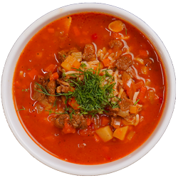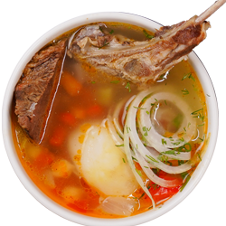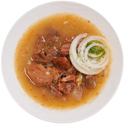 Mol goʼshti, qoʼy goʼshti, kartoshka, sabzi, pomidor, bulgʼor svetofori, noʼxat, ziravorlar va tuz