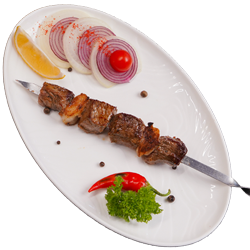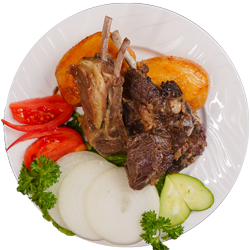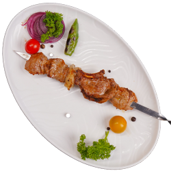 Yumshoq qilib pishirilgan barra qoʼy goʼshti, piyoz, pomidor va bodring boʼlaklari, koʼkatlar