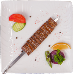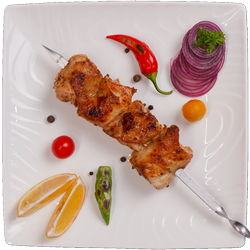 Kontir file, dumba, maxsus sous, ziravorlar, limon boʼlagi, qizil va yashil qalampir, cherri pomidorlari, piyoz
