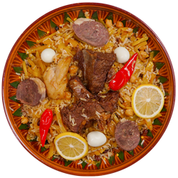 Lazer guruchi, qoʼy va mol goʼshtlari, zigʼir yogʼi, dumba, sariq sabzi, noʼxot va magizlar bilan boyitilgan ziravorlar, qazi va bedana tuxumlari