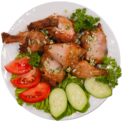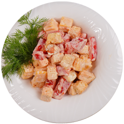 Qizartirib qovurilgan tovuq goʼshti, mayda toʼgʼralgan sarimsoq, pomidor va bodring boʼlaklari, koʼkatlar