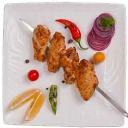 Tovuq qanotlari, limon boʼlagi, qizil va yashil qalampir, cherri pomidorlari, piyoz