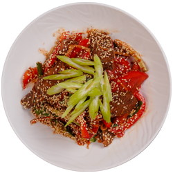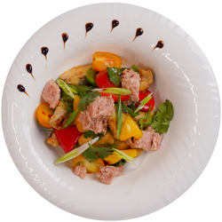 Qovurilgan baqlajon, tunets, cherri mpomidori, bulgʼor qalampiri, kunjut, limon soki, arayda sous