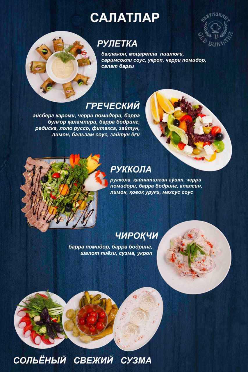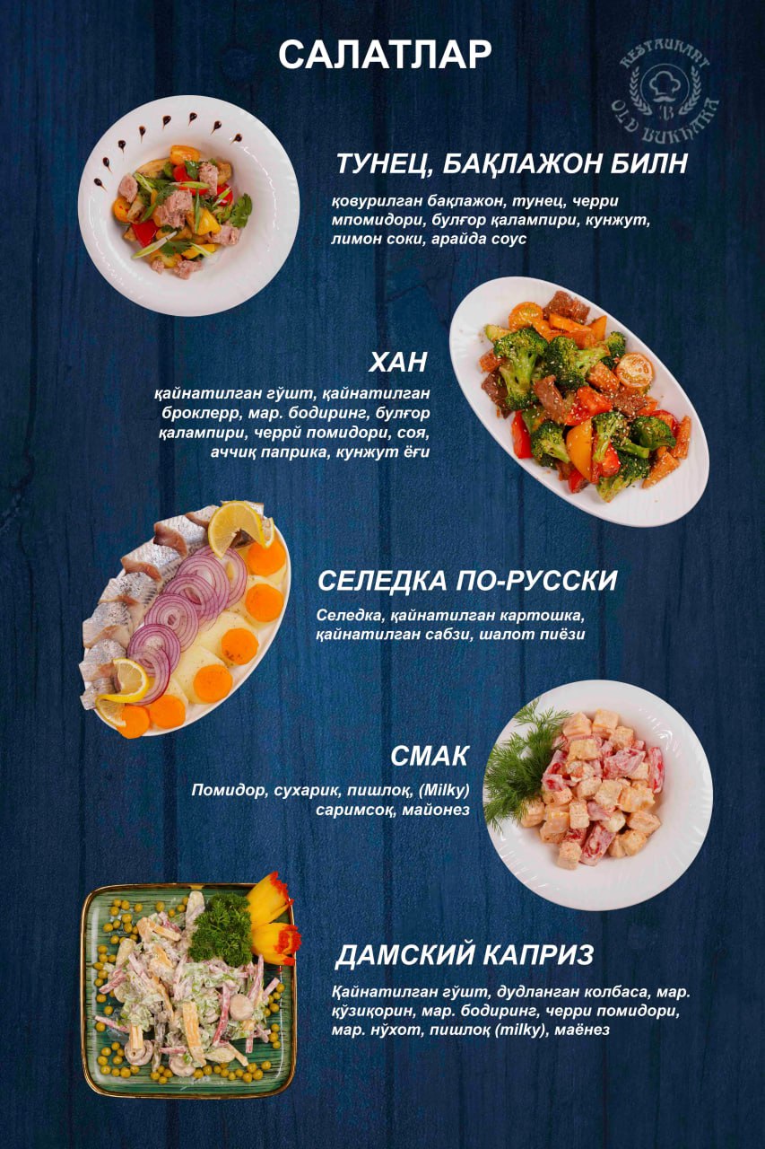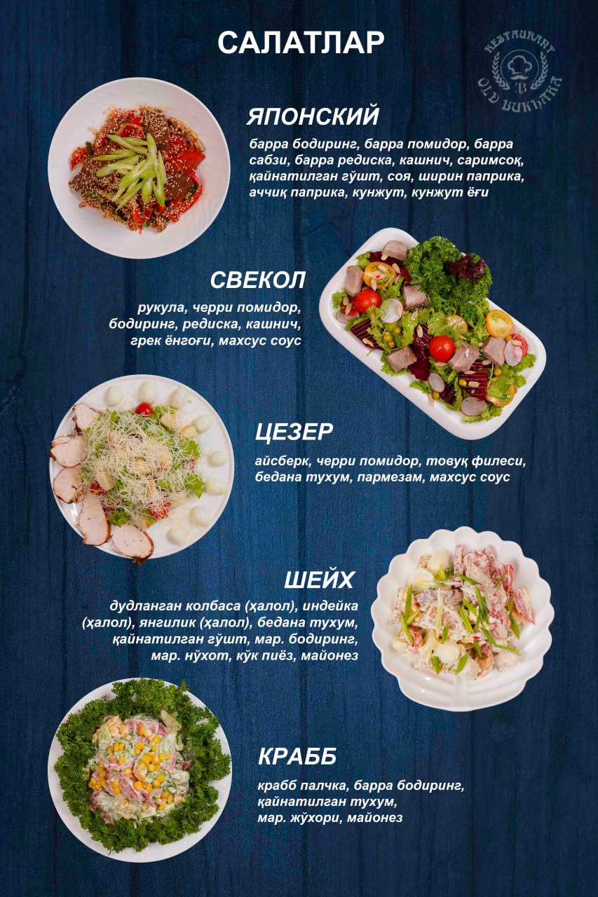 Salatlarni tayyorlashda eng sara va barra maxsulotlardan foydalaniladi va san'at asari sifatida taqdim qilinadi