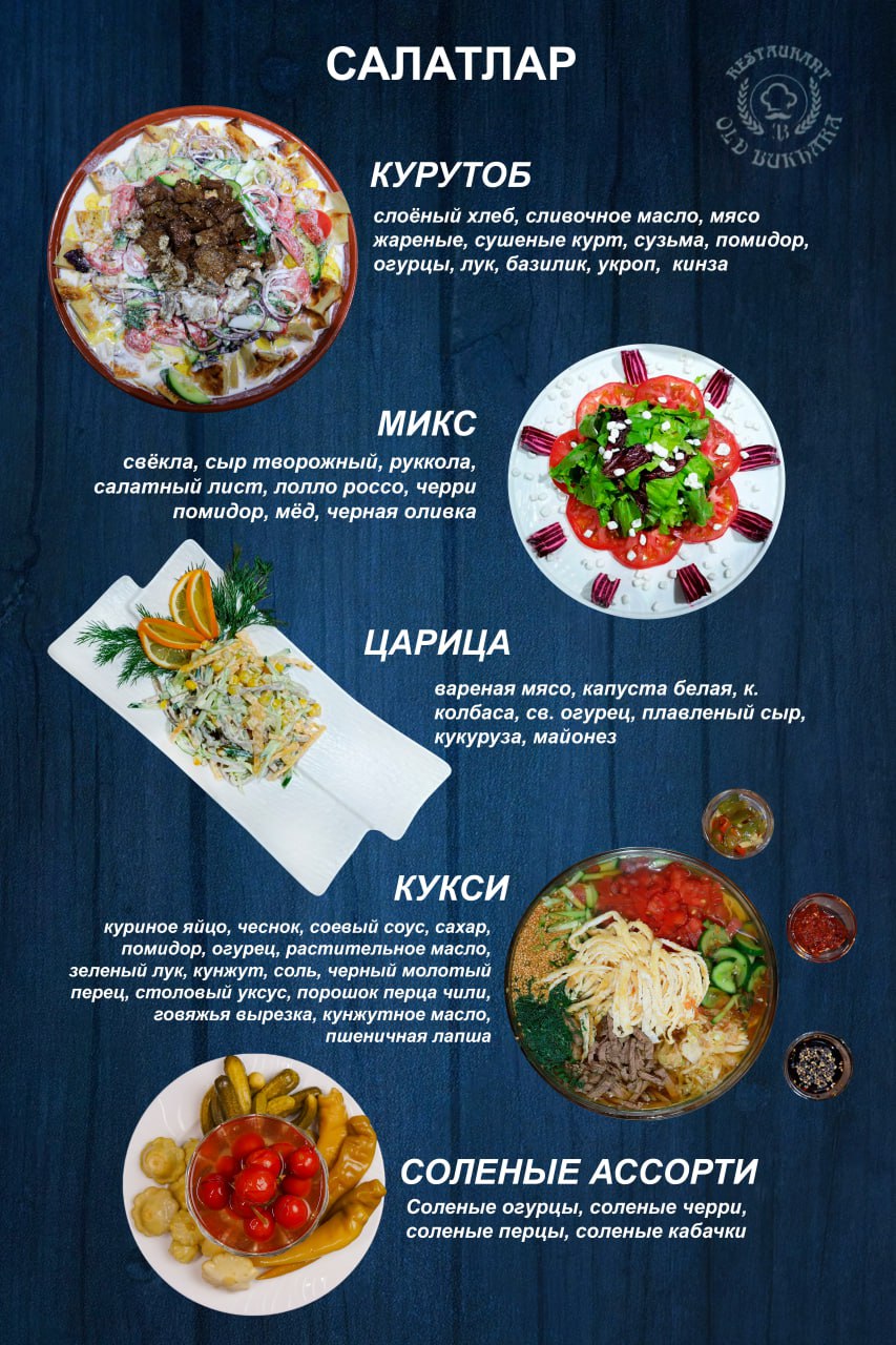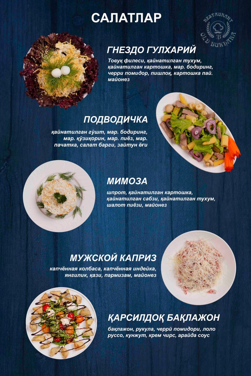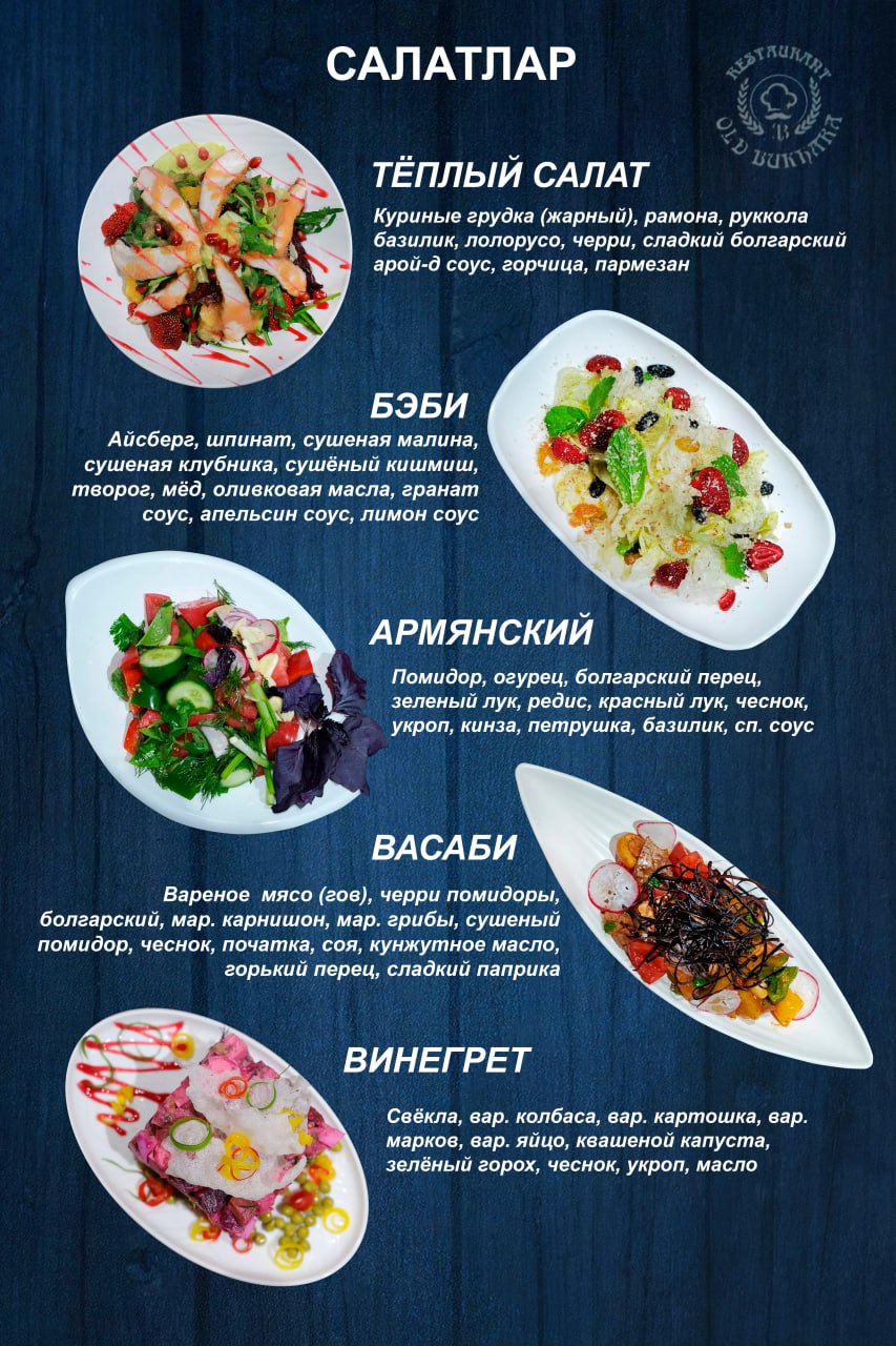 Salatlarni tayyorlashda eng sara va barra maxsulotlardan foydalaniladi va san'at asari sifatida taqdim qilinadi